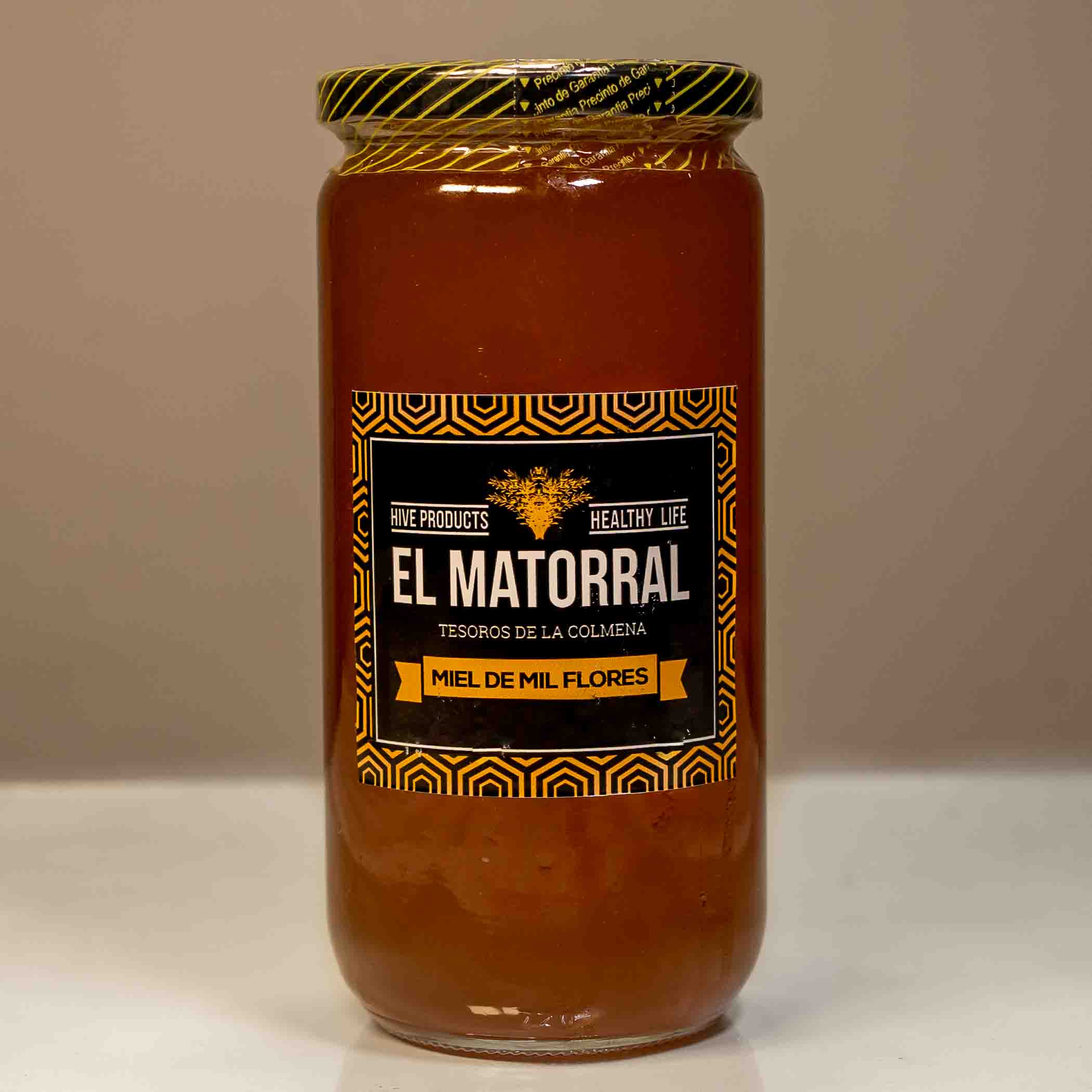 La Miel de Milflores “El Matorral”, es probablemente de las mejores mieles que te vas a echar al paladar. Es 100% natural y ecológica. Sin aditivos. Esta miel cruda de abeja tiene una calidad extraordinaria, siendo recolectada y envasada sin procesos mecánicos ni químicos, directa del panal al tarro. Las abejas que producen esta miel recogen polen de diversas flores, sobretodo de tomillo y de romero.